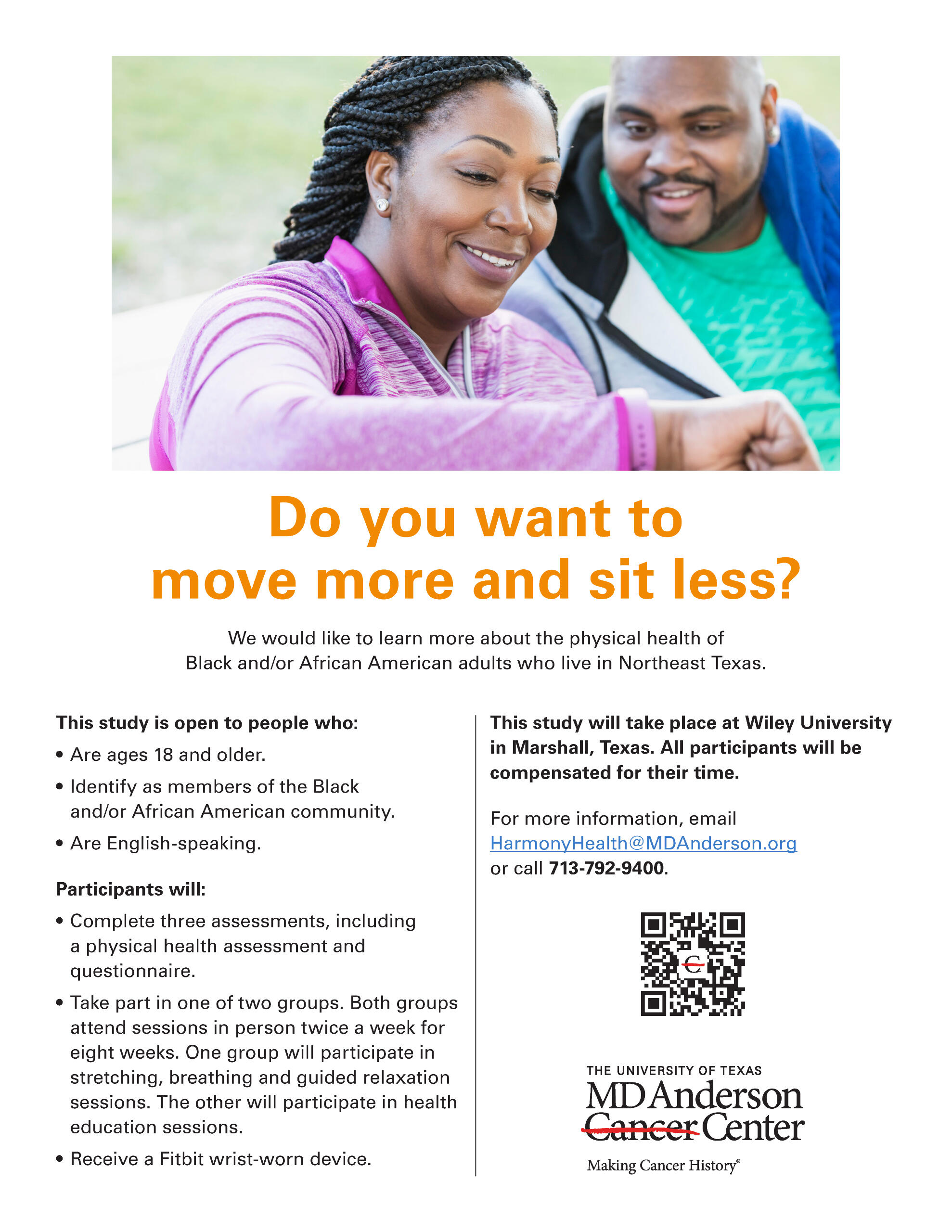 education sessions twice a week for 8 weeks and completing three assessments with our study team. Participants will be compensated for their time and provided with a Fitbit wrist-worn device. This study will take place at Wiley University in Marshall, Texas, and is being conducted by researchers at The University of Texas MD Anderson Cancer Center. For more information, please contact our study team by phone at (713) 792-9400 or by email at HarmonyHealth@mdanderson.org